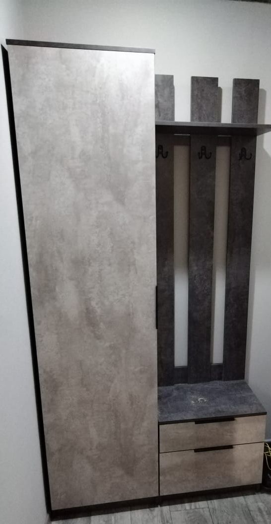 1. **Шкаф**: Высокий шкаф предоставляет достаточно места для хранения верхней одежды, аксессуаров и других вещей. Внутри могут быть предусмотрены полки и штанга для вешалок, что позволяет рационально организовать пространство.