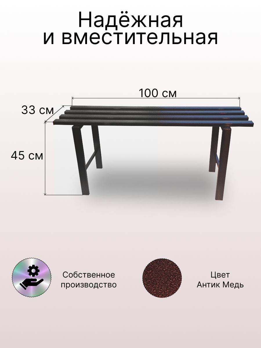 Скамейка универсальная, металлическая в современном стиле. Изготовлена из прочной стали. Каркас скамейки разборный, выполнен из металлического профиля 20х40мм окрашен в порошково- полимерную краску цвет Антик медь. Две опоры соединены между собой металлической траверсой для надежности. Скамейка поставляется в разобранном виде в 1 упаковке, комплект крепежа входит в комплектацию. Легкая и быстрая сборка.